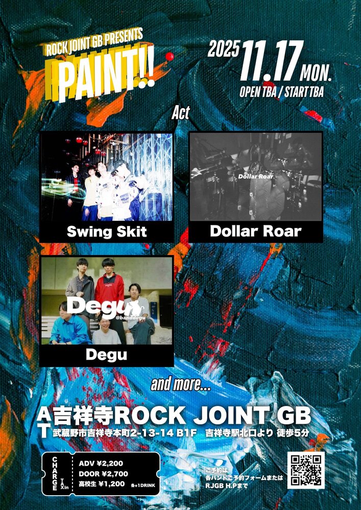 Live info 「PAINT!!」at Kichijoji ROCK JOINT GB SCHEDULE 2025/11/17(月) 吉祥寺ROCK JOINT GB 地図を表示 ACT: Degu Swing Skit Dollar Roar and more... チケット購入はこちら URLをコピーする 報告する