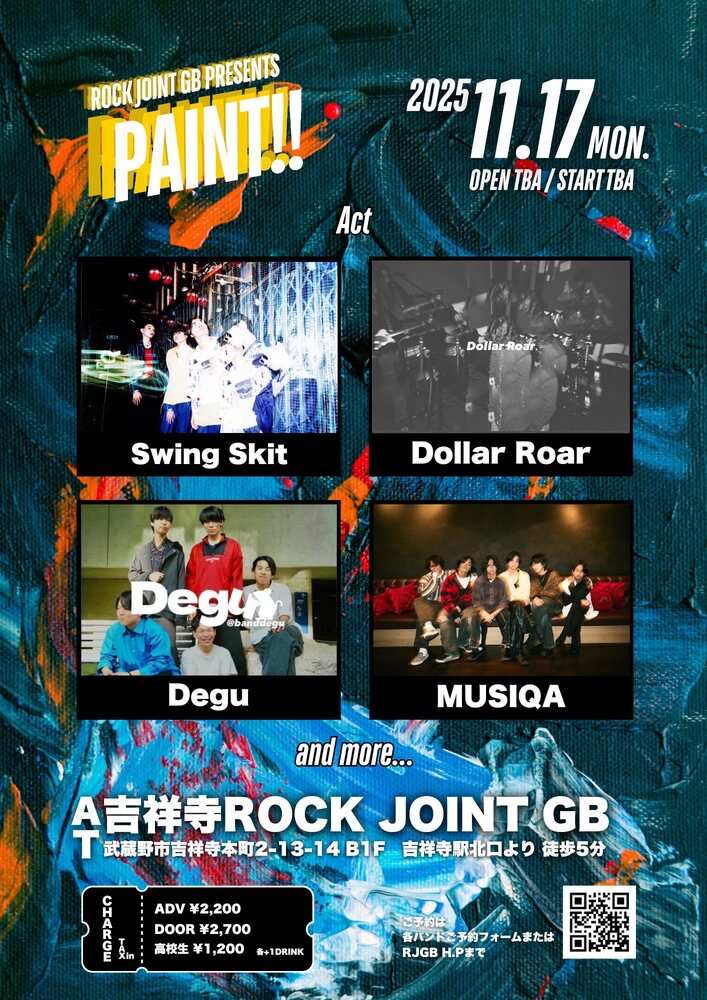 Live info 「PAINT!!」at Kichijoji ROCK JOINT GB LIVE 2025/11/17(月) 18:45 - 23:59 吉祥寺ROCK JOINT GB 地図を表示 OPEN 18:15/START 18:45 ACT: Degu Swing Skit Dollar Roar MUSUQA and more... チケット購入はこちら URLをコピーする 報告する