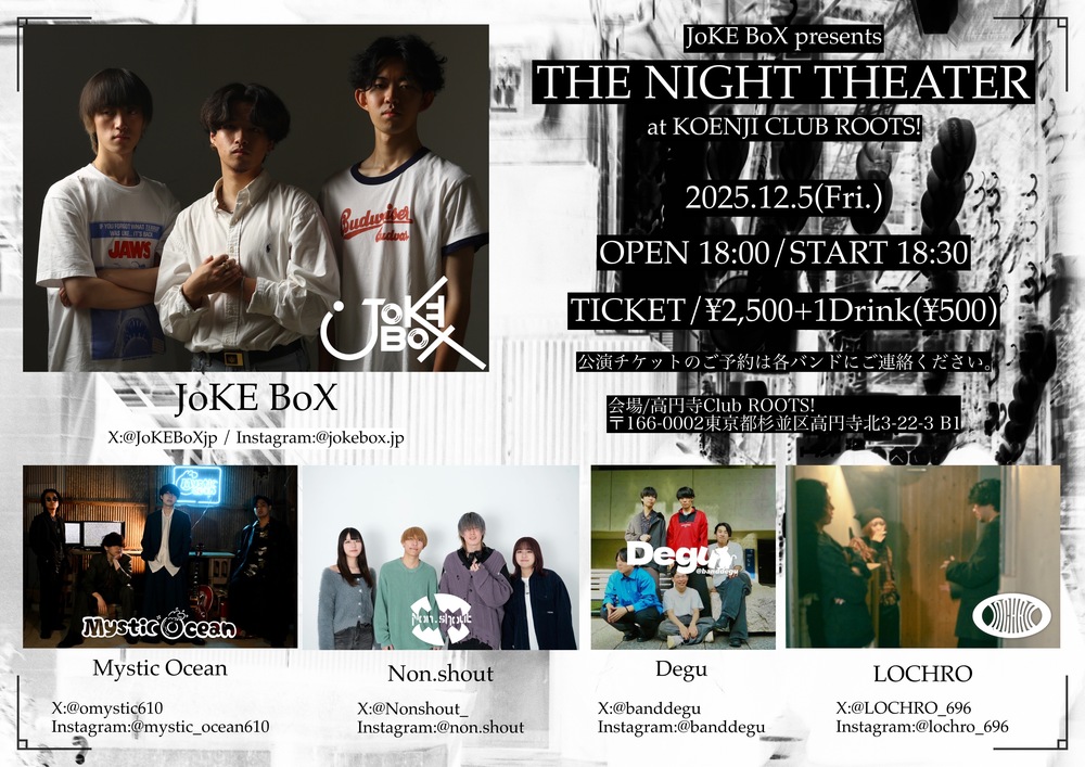 Live info 「THE NIGHT THEATER」at Koenji Club ROOTs! LIVE 2025/12/05(金) 18:30 - 高円寺Club ROOTs! 地図を表示 OPEN 18:00/START 18:30 ACT: Degu Mystic Ocean Non.shout LOCHRO URLをコピーする 報告する